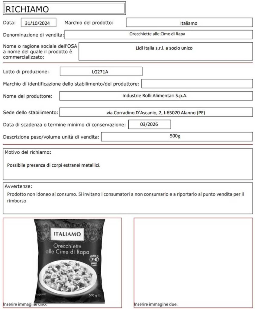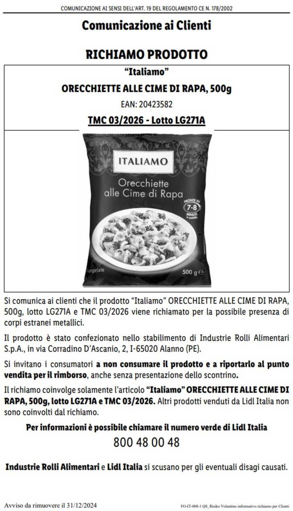 Lidl e il Ministero della Salute hanno pubblicato un avviso di richiamo dal mercato per un lotto di Orecchiette alle cime di rapa Italiamo. Il motivo risiede nella possibile presenza di corpi estranei metallici nel prodotto, che quindi espone i consumatori a un possibile rischio fisico. Si tratta del lotto LG271A con scadenza 03/2026.